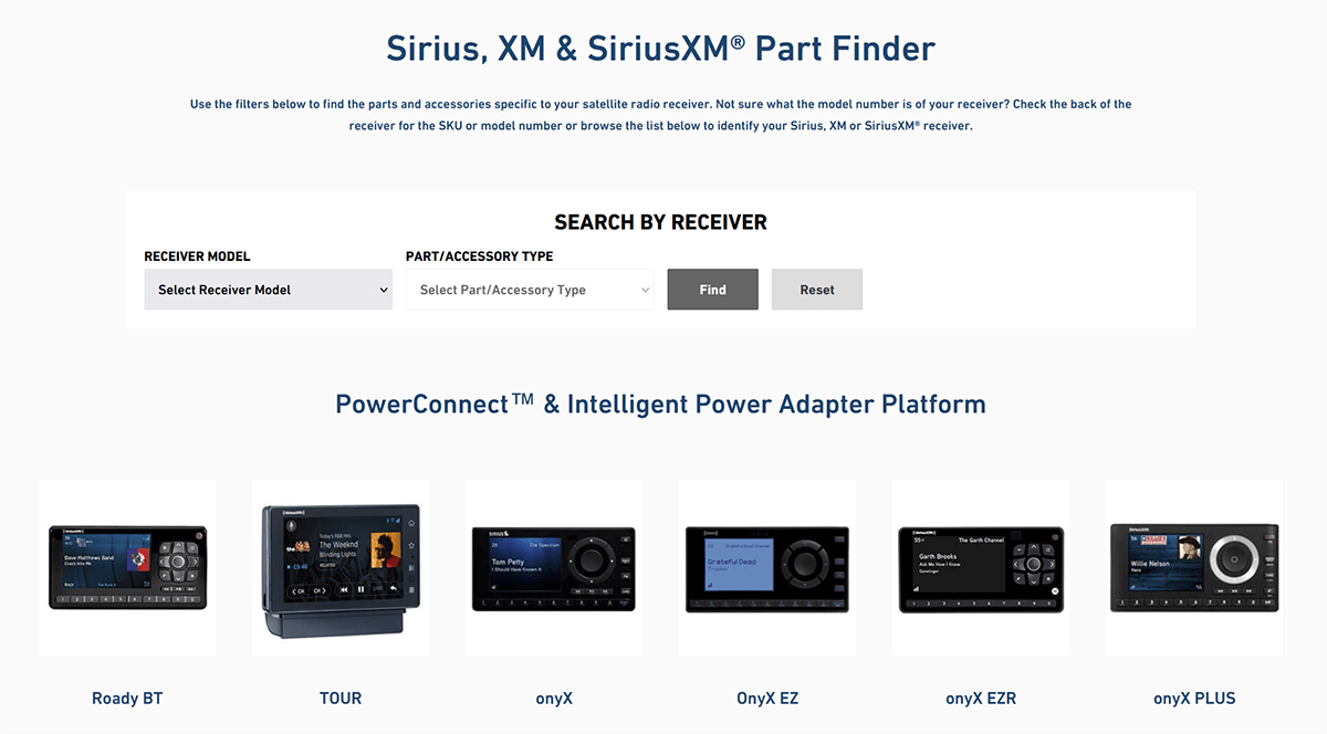 Our satellite radio part finder allows you to search by your receiver/radio model and part/accessory type so you know for sure the part you buy will be the right one for your radio.